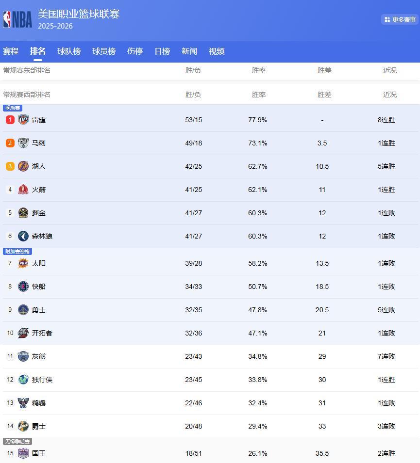 西部最新排名: